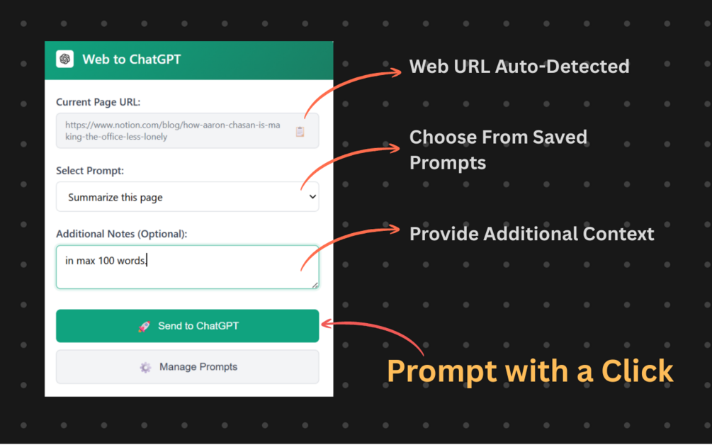 Seamlessly send web page URLs and custom prompts to ChatGPT for instant summaries, content generation, and more.